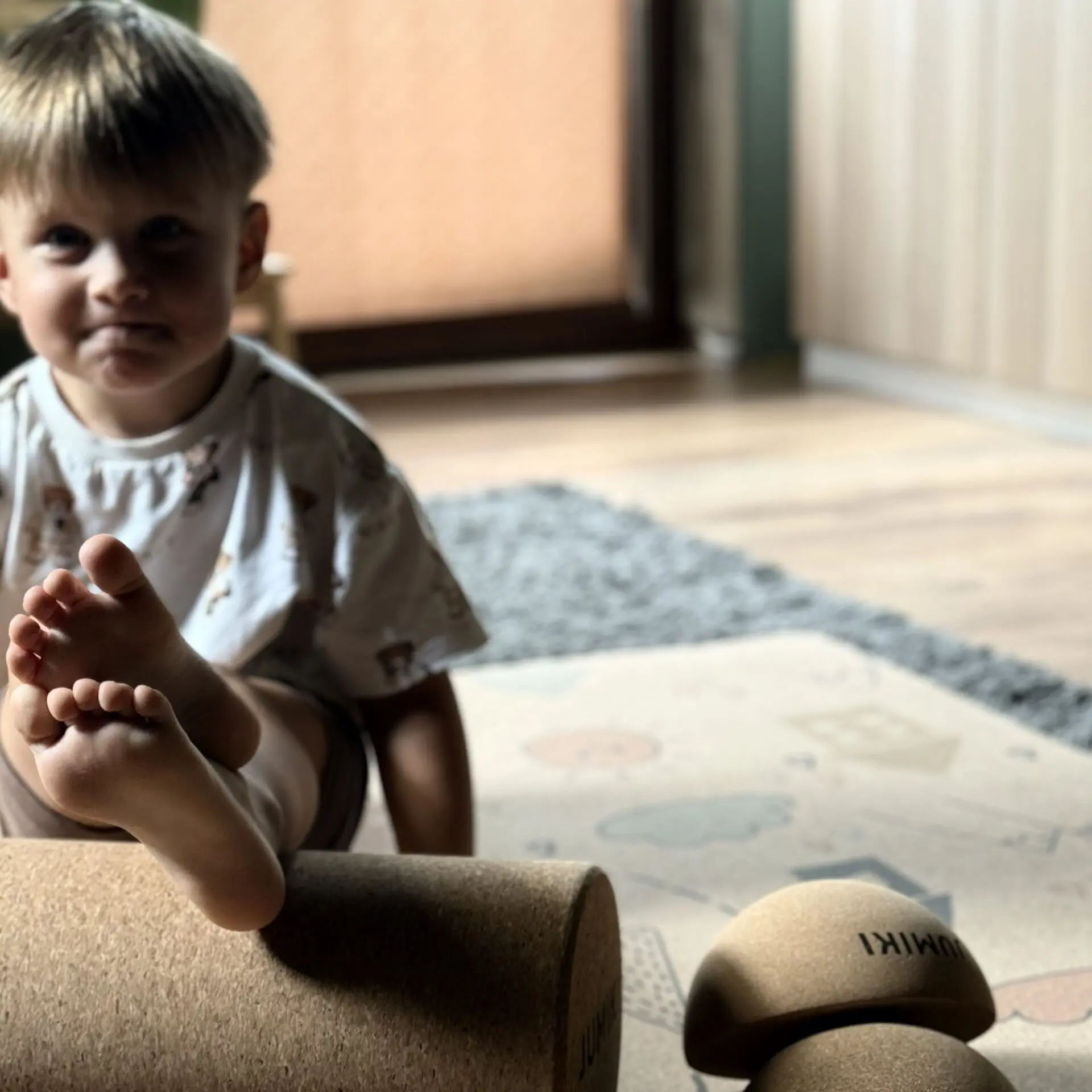 Duży wałek o wszechstronnym zastosowaniu, który świetnie sprawdza się w aktywności dziecięcej. Może być używany do toczenia – rękami w klęku lub stopami w siadzie, co wspiera koordynację wzrokowo-ruchową i rozwój czucia głębokiego. Roller nadaje się również do ćwiczeń równoważnych, angażuje całe ciało i uczy stabilizacji. Dzięki swojej masie pozwala na proste ćwiczenia siłowe, takie jak podnoszenie czy przesuwanie, co wzbogaca trening o dodatkowe bodźce. Dodatkowym atutem jest fantastyczna struktura korka – naturalna faktura jest przyjemna w dotyku i posiada właściwości sensoryczne, co zachęca dzieci do kontaktu z materiałem i uatrakcyjnia ćwiczenia.