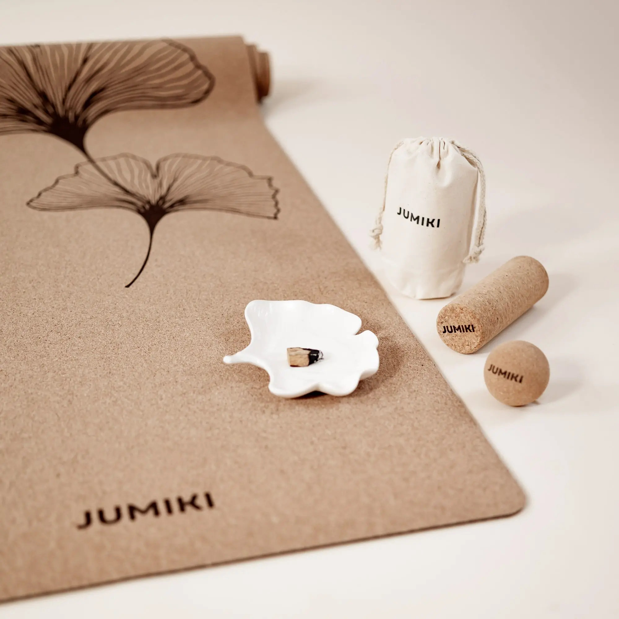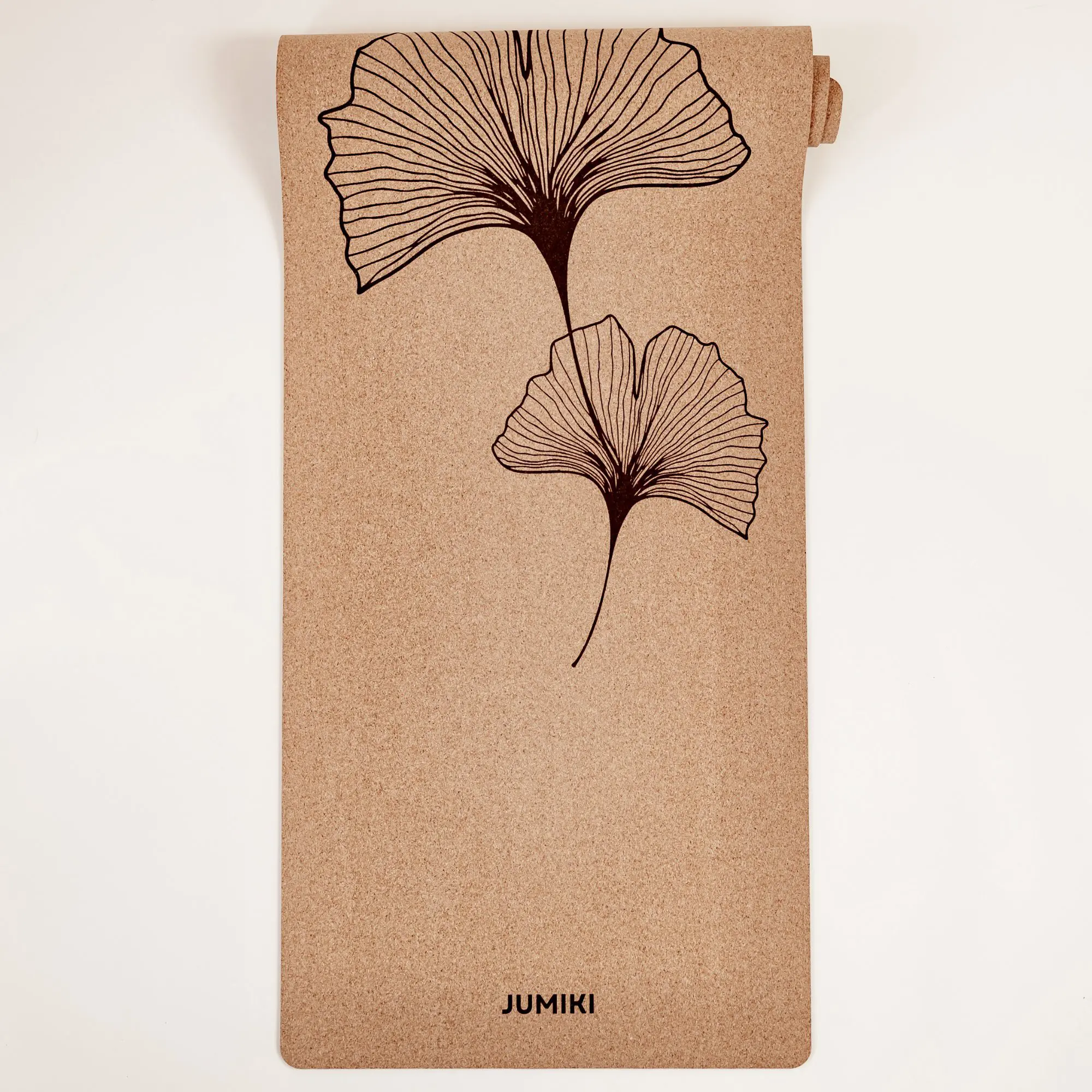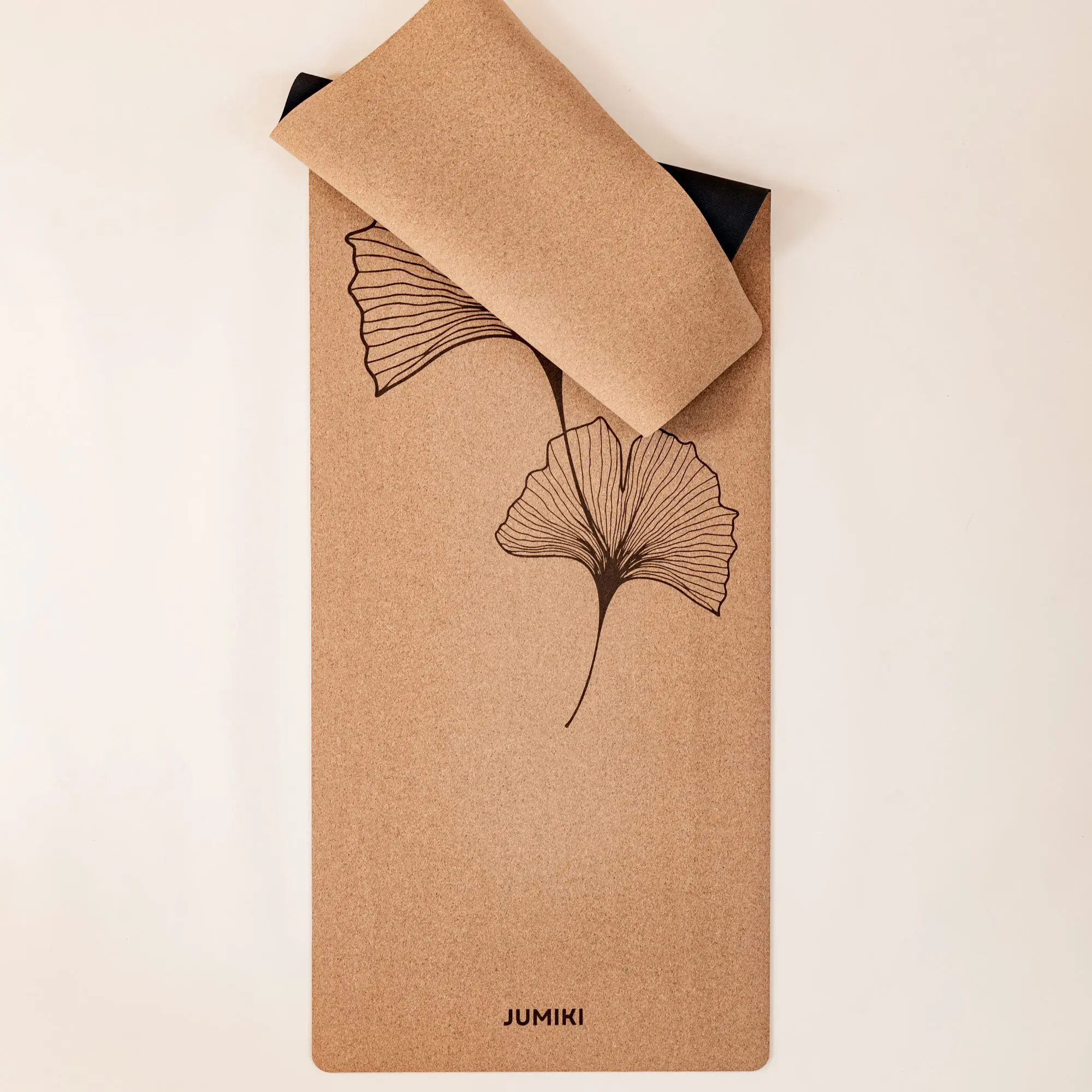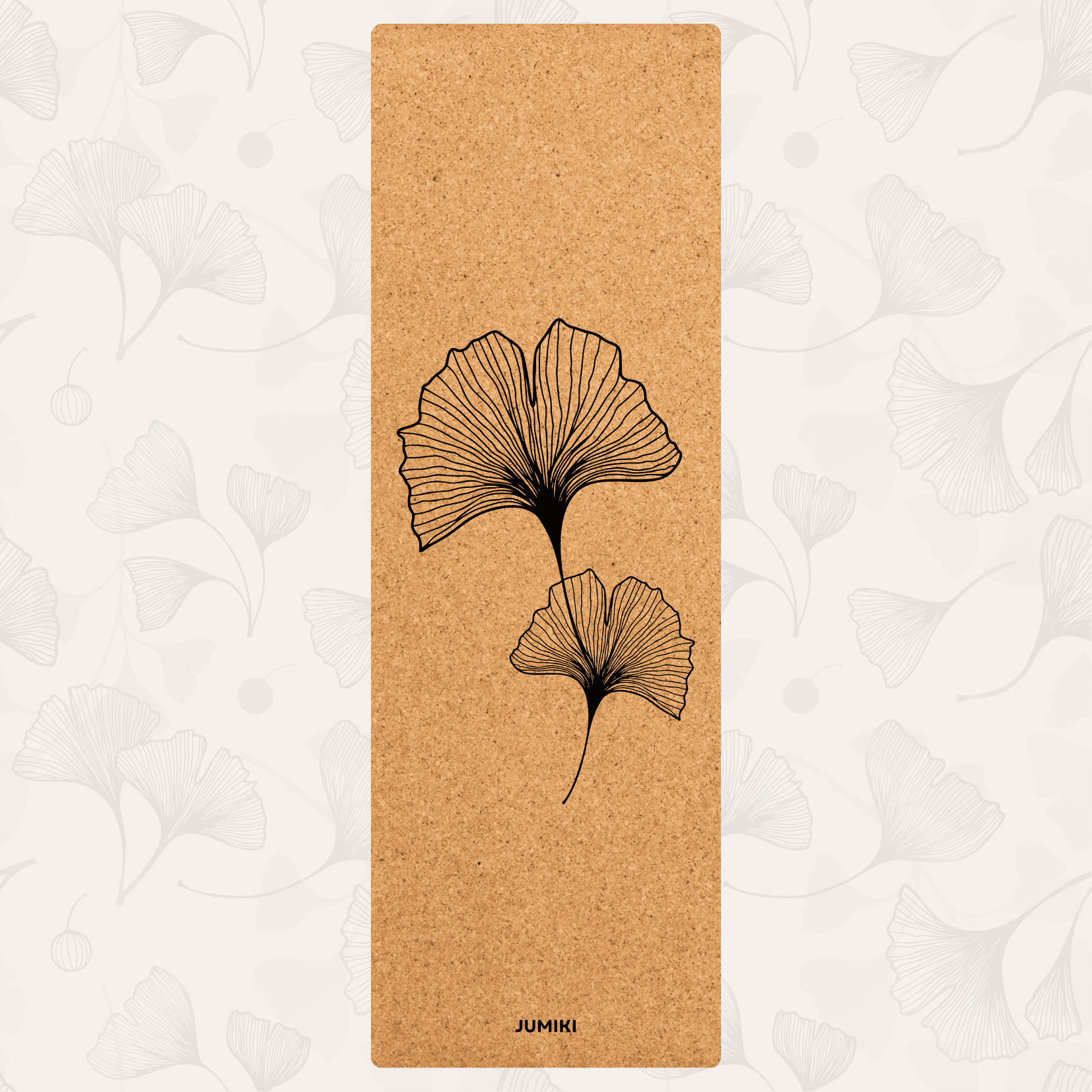 Mata do ćwiczeń JUMIKI GINKGO M łączy w sobie naturalność, prostotę i inspirujący design. Na ciepłym tle naturalnego korka widnieją dwie liście miłorzębu japońskiego – symbol siły, wytrwałości i harmonii. To mata, która zaprasza do uważnego ruchu i głębszego kontaktu z naturą.
