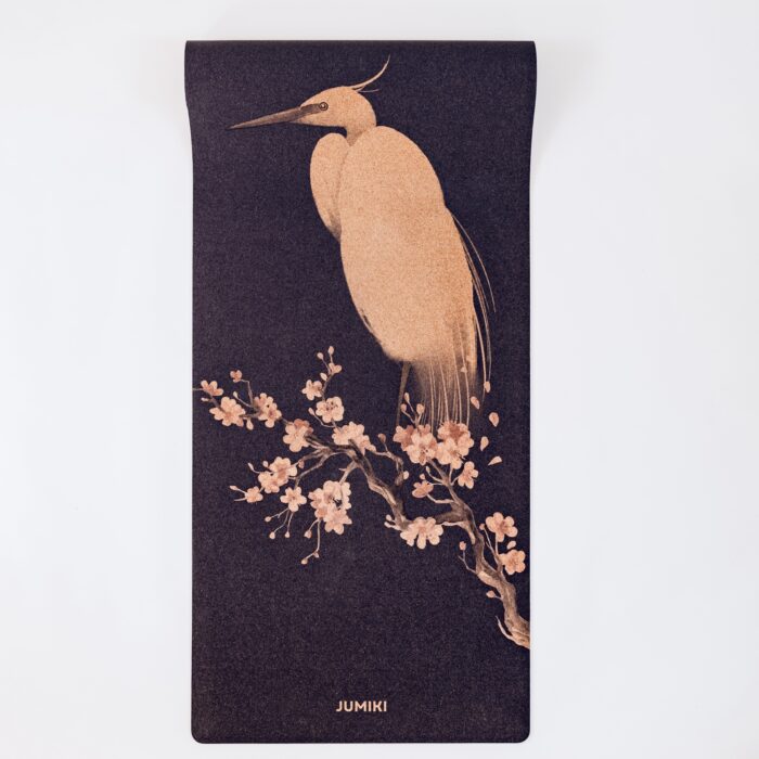 Mata JUMIKI PO ZMROKU L to elegancka korkowo-kauczukowa mata do ćwiczeń z grafiką nocnej czapli wśród kwitnącej wiśni. Naturalny korek zapewnia antypoślizgową powierzchnię, a baza z kauczuku stabilność i amortyzację. Idealna do spokojnej, uważnej praktyki.